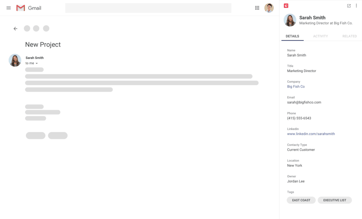 When you update your contacts' information in Gmail, everything is automatically updated in your CRM (and vice versa). Say goodbye to hours of copying and pasting your contact database.